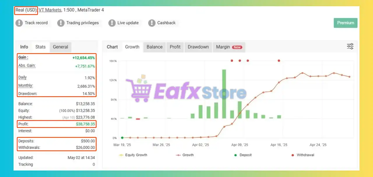 The Blox EA has demonstrated extraordinary trading performance on a verified Myfxbook account. Below is a breakdown of the key metrics and what they reveal about the Expert Advisor (EA):