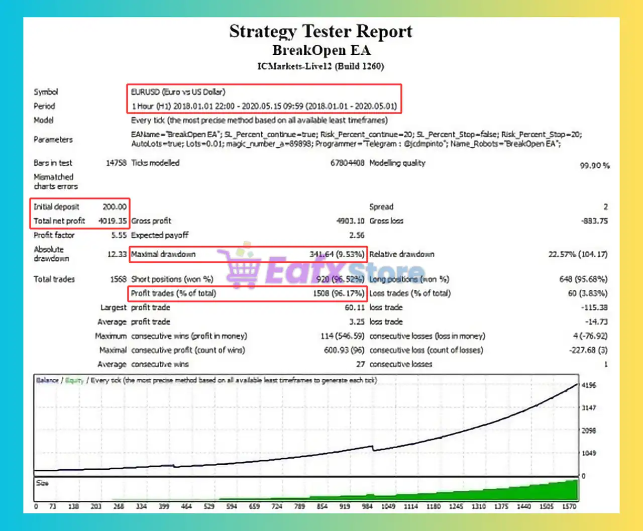 The BreakOpen EA backtest trading results achieved impressive profit performance for 29 months on the EURUSD.