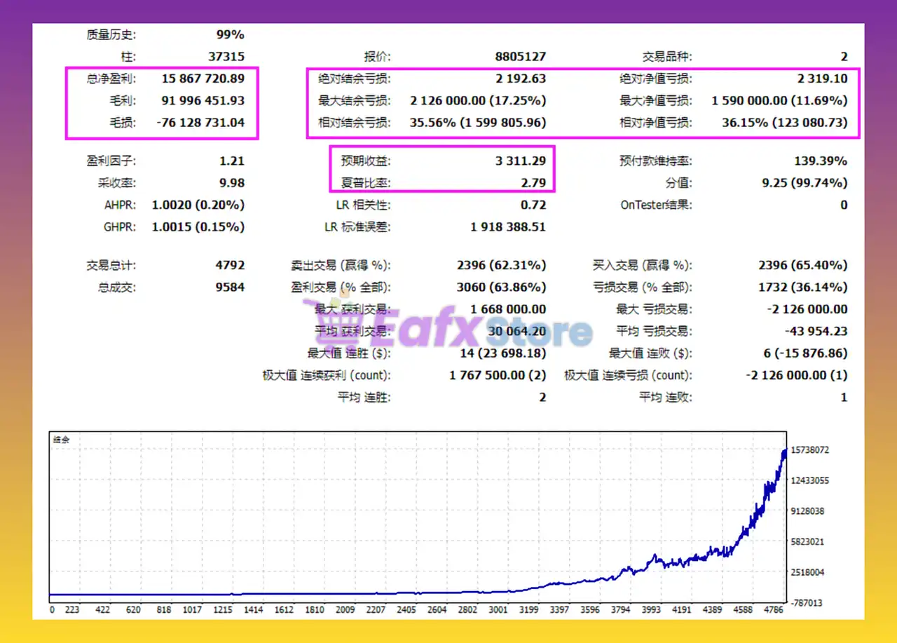 ✅ Yes. Real account signal results show a +47% growth in four consecutive weeks with only 19.50% maximum drawdown. Backtest results over 5 years also achieved $15.86M net profit from a $10,000 deposit with 17.25% drawdown and a 63.86% win rate.
