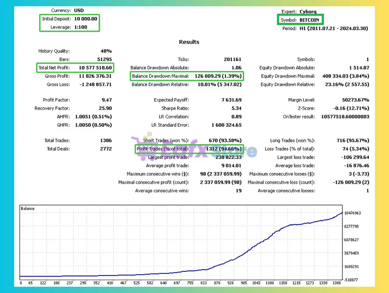 🔶 The Cyberosaur Ex backtest trading results achieved impressive profit performance for 13 years on the BITCOIN pair.
