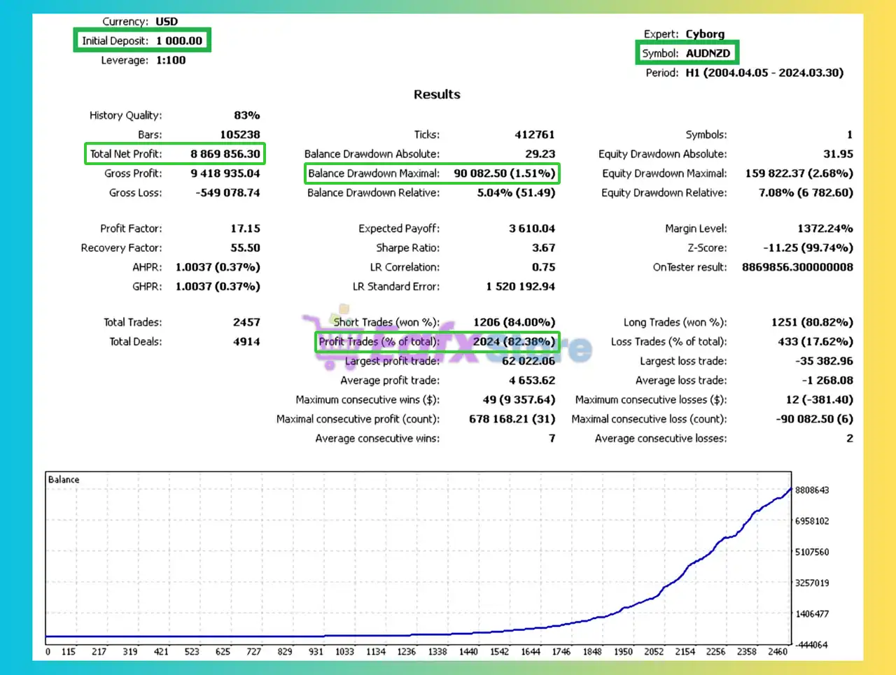 🔶 The Cyberosaur Ex backtest trading results achieved impressive profit performance for 20 years on the AUDNZD pair.