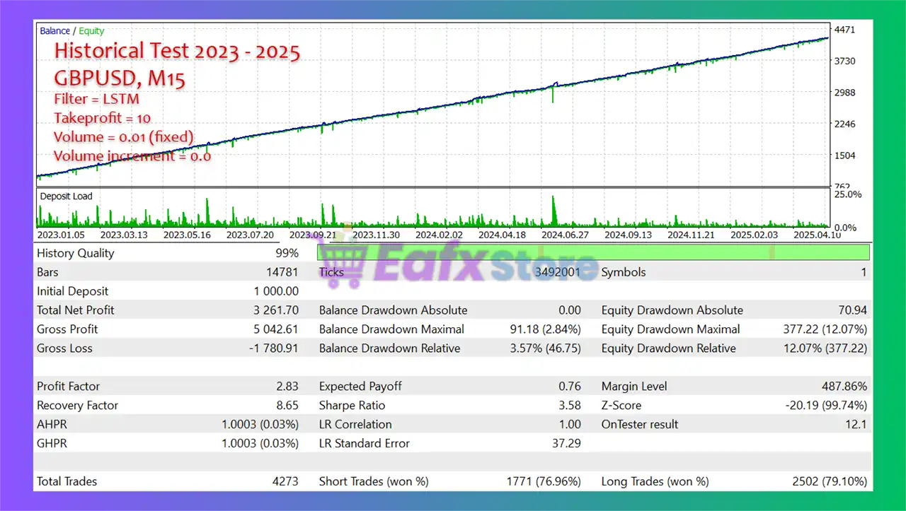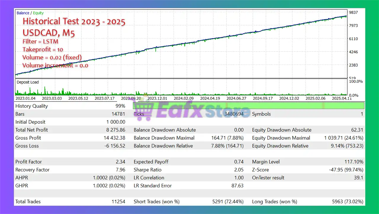 In multi-pair backtests from 2023–2025, the EA achieved consistent gains — e.g., $8,276 profit on USDCAD M5 and $6,588 profit on EURUSD H1 — with drawdowns between 2.8%–7.8%, demonstrating excellent risk-adjusted returns.