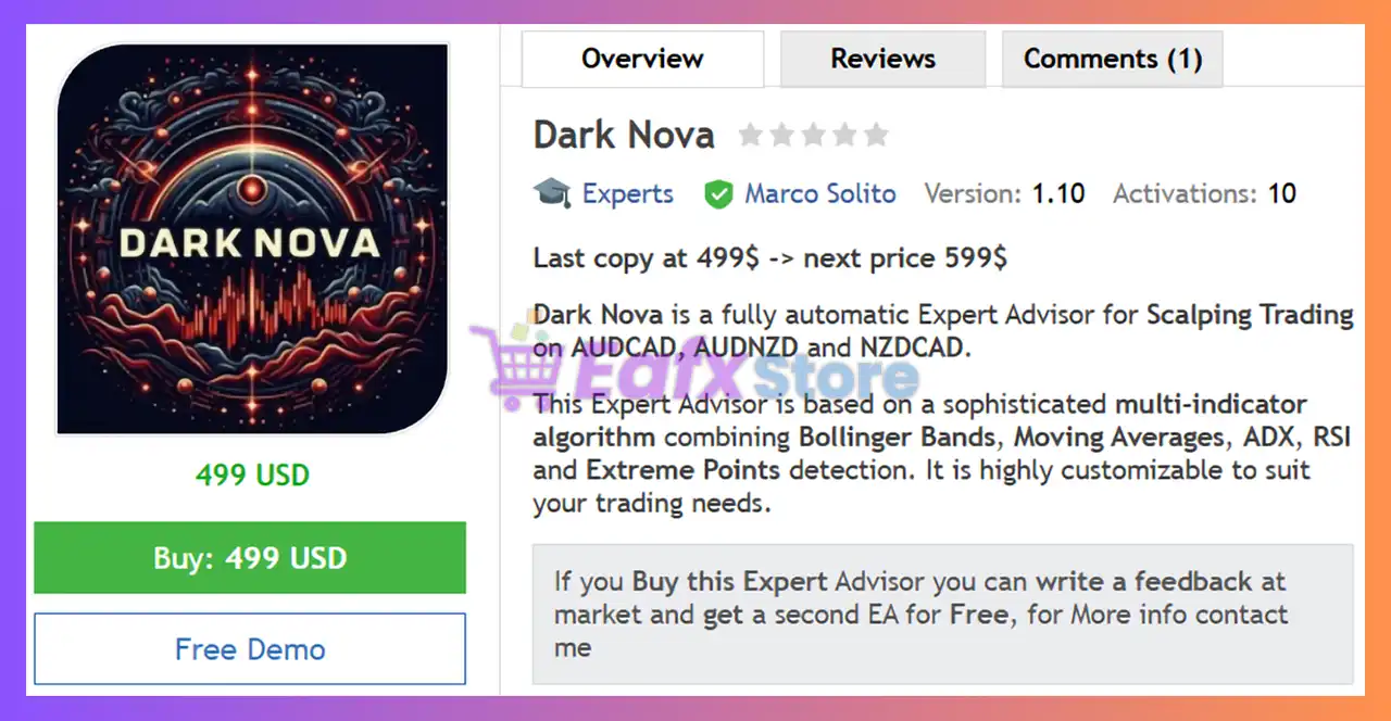 This product is compiled by Marco Solito. This author has more than +8 years of experience working on MQL5 with many famous products such as Dark Nova EA MT4, Dark Nova MT5, Dark Gold MT5, Dark Algo MT5, Dark Algo MT4, Dark Titan MT5, Dark Venus MT5 and others. Among them, Dark Nova MT4 is his best performing products.