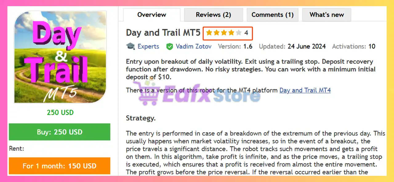 This product is compiled by Vadim Zotov. This author has more than +10 years of experience working on MQL5 with many famous products such as Day and Trail MT5, Day Breakout MT5, Gap Professional MT5, Lock Balancer MT5Total Lock MT4 and other advisors. Among them, Day and Trail MT5 is his best performing product.