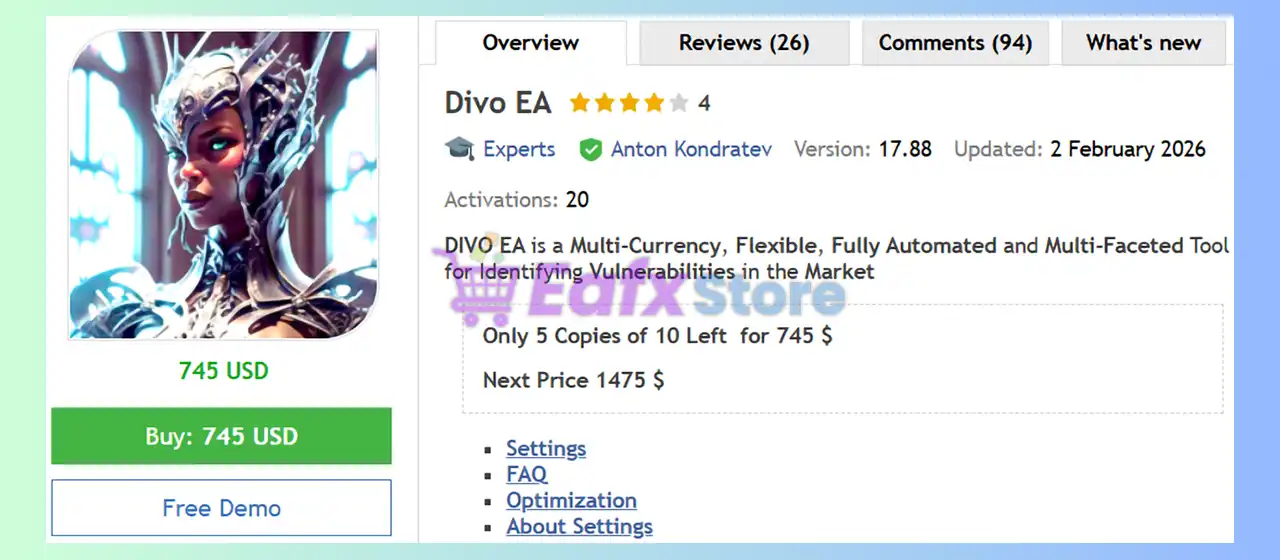 This product is compiled by Anton Kondratev. This author has more than +4 years of experience working on MQL5 with many famous products such as Divo EA MT5, Zeno EA MT5, Enza EA MT5, Razor MT5, Aurum MT5, Nova EA MT5, DOW King EA MT5, Zonda EA MT5 and other advisors. Among them, Divo EA is his best performing product.