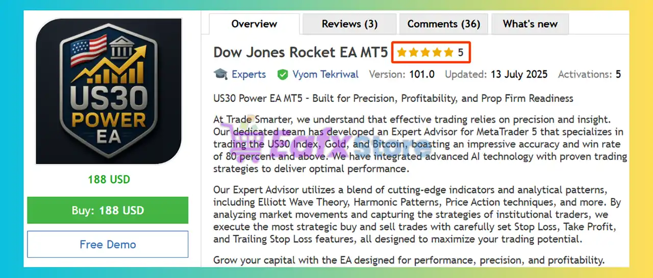 This product is compiled by Vyom Tekriwal. This author has more than +1 years of experience working on MQL5 with many famous products such as Dow Jones Rocket EA MT5, Gold Aurum Quant Pro MT5 AI Robot, Gold Sniper Alpha AI Robot MT5, SatoshiMind AI Bitcoin Robot MT4 and other advisors. Among them, Dow Jones Rocket EA MT5 is his best performing product.