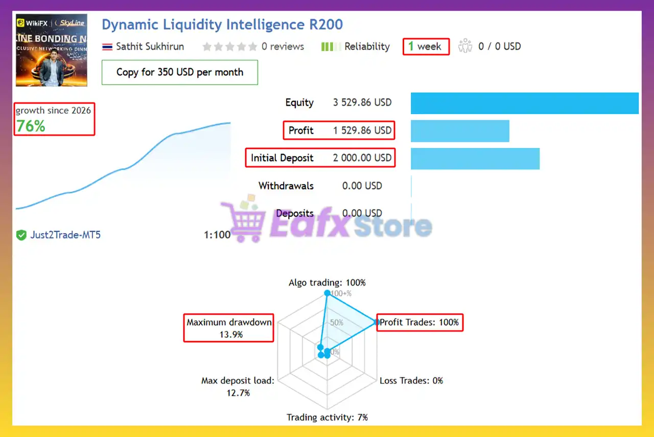🔶 The Dynamic Liquidity Intelligence MT5 achieved impressive profit performance when trading with XAUUSD & forex pairs. The results of trading on a live account over 1 weeks with a $100 deposit.