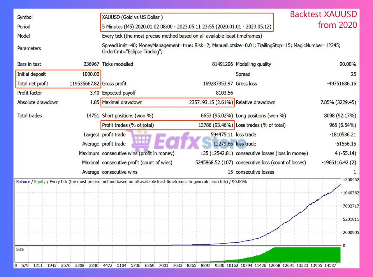 In a comprehensive backtest over 3 years on the XAUUSD pair, Eclipse Trading EA showed extraordinary results: