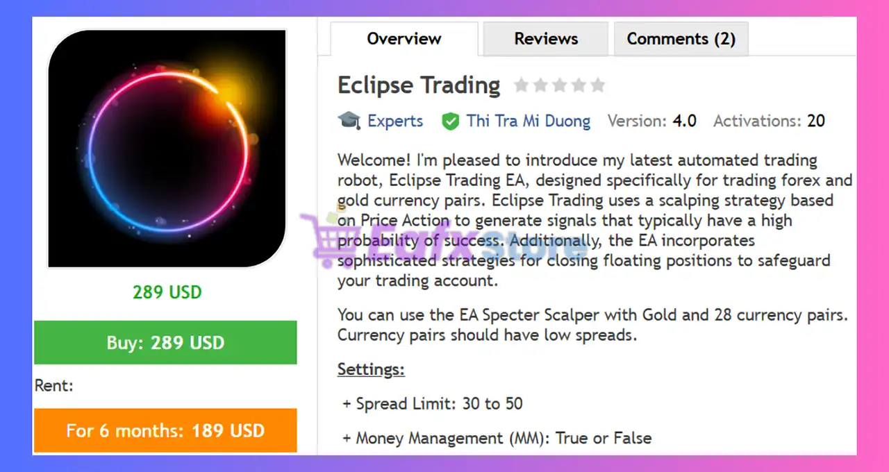 This product is compiled by Thi Tra Mi Duong. This author has more than +4 years of experience working on MQL5 with many famous products such as Eclipse Trading EA MT4, Epic Gold EA MT4, Micro Scalper MT4, Epic Gold EA MT4 and other advisors. Among them, Eclipse Trading EA is his best performing product.