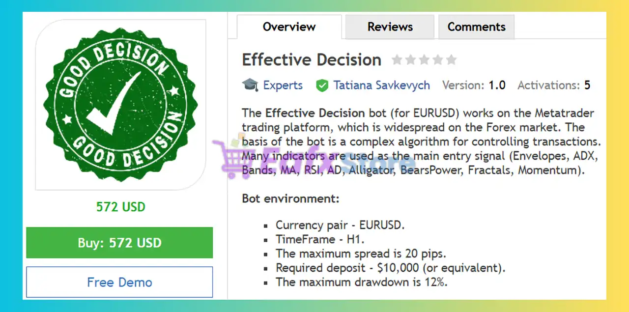 This product is compiled by Tatiana Savkevych. This author has more than +4 years of experience working on MQL5 with many famous products such as Effective Decision MT4, Sirius M4 MT4, Case Automatic MT4, Genostype ADV MT4, Navigator FX Expert and other advisors. Among them, Effective Decision EA is his best performing product.
