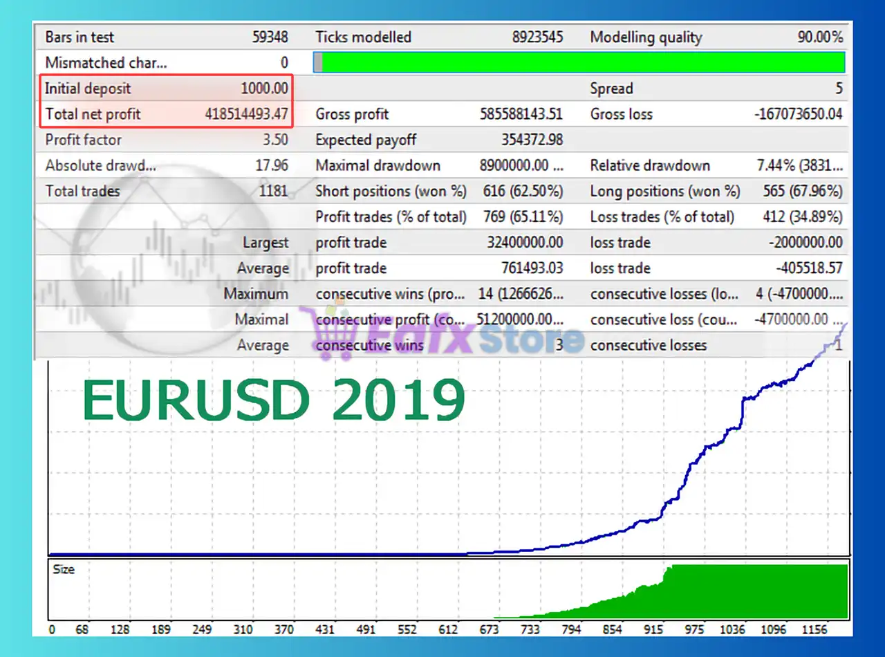 ✅ EURUSD: $1,000 → $418,510 profit, 65.11% win rate, 7.44% max drawdown.