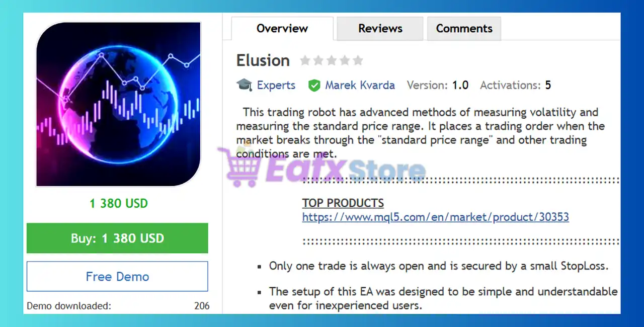 This product is compiled by Marek Kvarda. This author has more than +9 years of experience working on MQL5 with many famous products such as Elusion MT4, Forebot MT4, FXbot mt4, Triton MT4, Edger MT4 and other advisors. Among them, Elusion MT4 is his best performing product.