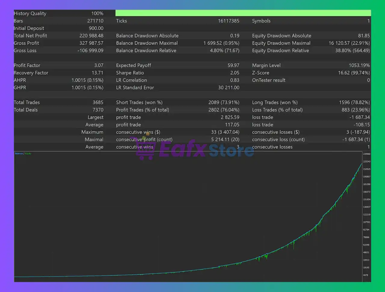 Real data from AUDCAD shows +4% growth in two weeks, an 88.90% win rate, and very low drawdown at 0.80%. Backtests over a 12-month period demonstrated $220,988+ in net profit from a $900 starting deposit with 3.20% drawdown, proving long-term stability across different market phases.