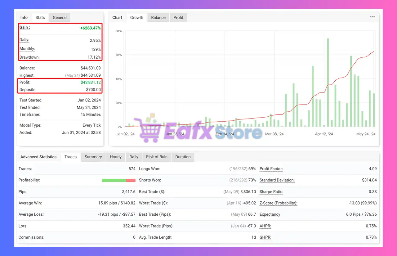 The EA works on any MT4 account with a minimum of $100, although larger balances (e.g., $300–$1,000) offer much safer grid spacing. It supports any leverage and any broker type, making it flexible for all trading conditions.
