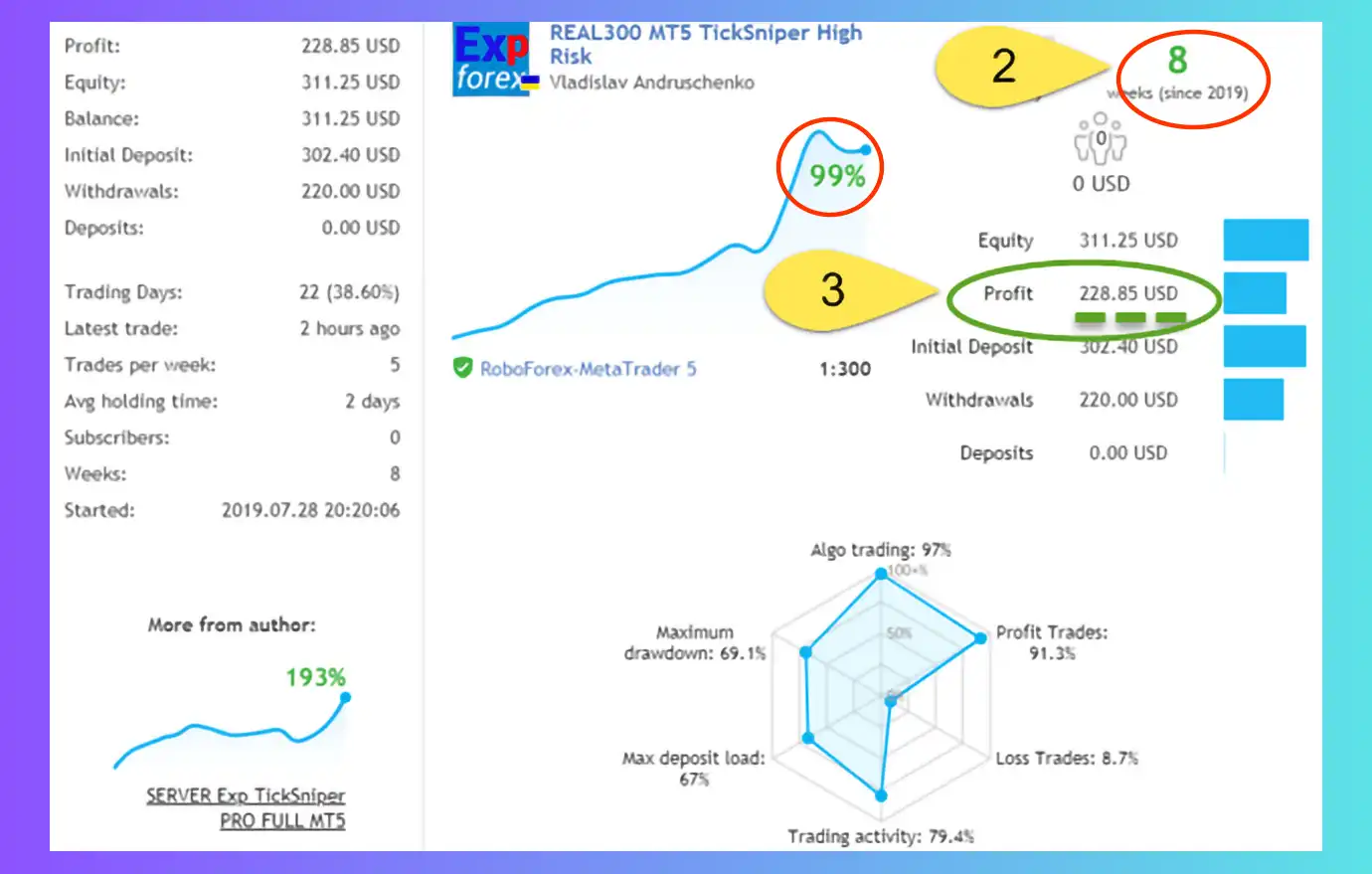 This product is compiled by Vladislav Andruschenko. This Ukraine author has more than +13 years of experience working on MQL5 with many famous products such as Exp TickSniper PRO FULL, Exp5 The xCustomEA for MT5Exp5 AI Sniper for MT5 and others. Among them, Exp TickSniper PRO FULL MT5 is his best performing product.