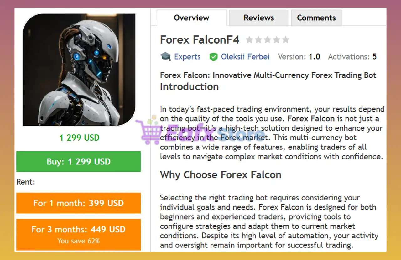 This product is compiled by Oleksii Ferbei. This author has more than +5 years of experience working on MQL5 with many famous products such as Forex FalconF4 MT4, Currency Curator Ex4, Insight AInvestor 4 MT4SafeSerie Managers MT4, Alien Titanus MT4 and other advisors. Among them, Forex FalconF4 EA is his best performing product.