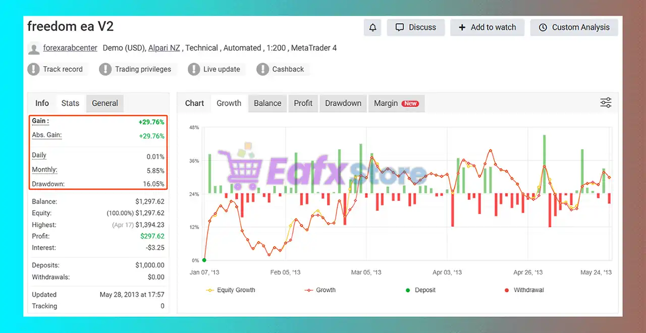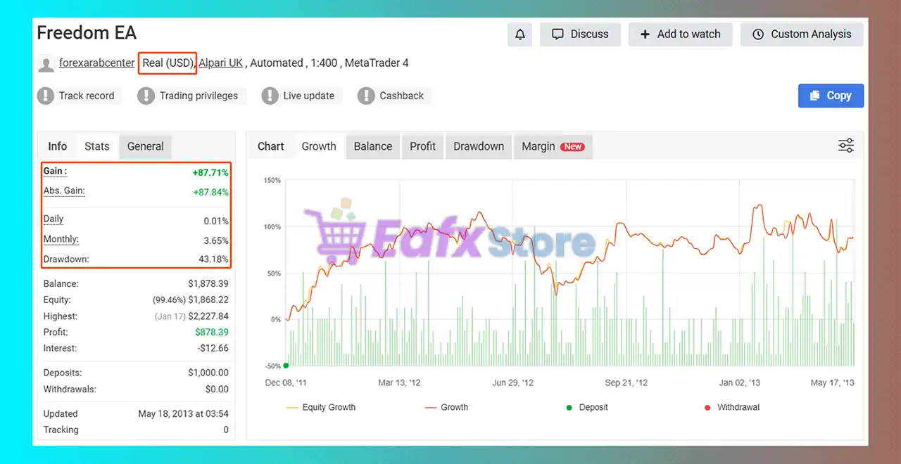 Because Freedom EA uses strict risk controls and avoids "toxic" trading behaviors, it is technically compatible with Prop Firm rules (like FTMO or MFF). However, because its monthly profit is conservative (~3.6%), traders may need to adjust risk settings to meet high-target profit goals within a short challenge window.