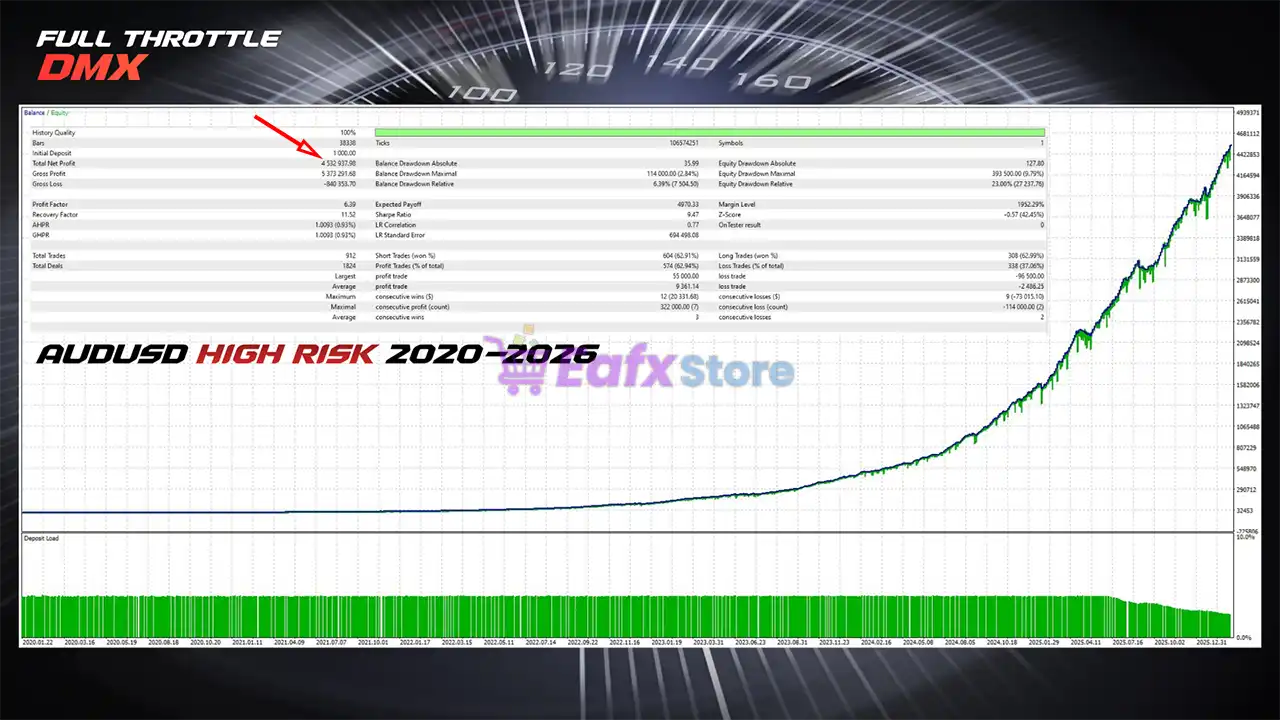 🔶 The Full Throttle DMX EA backtest trading results achieved impressive profit performance for 6 years on the AUDUSD.
