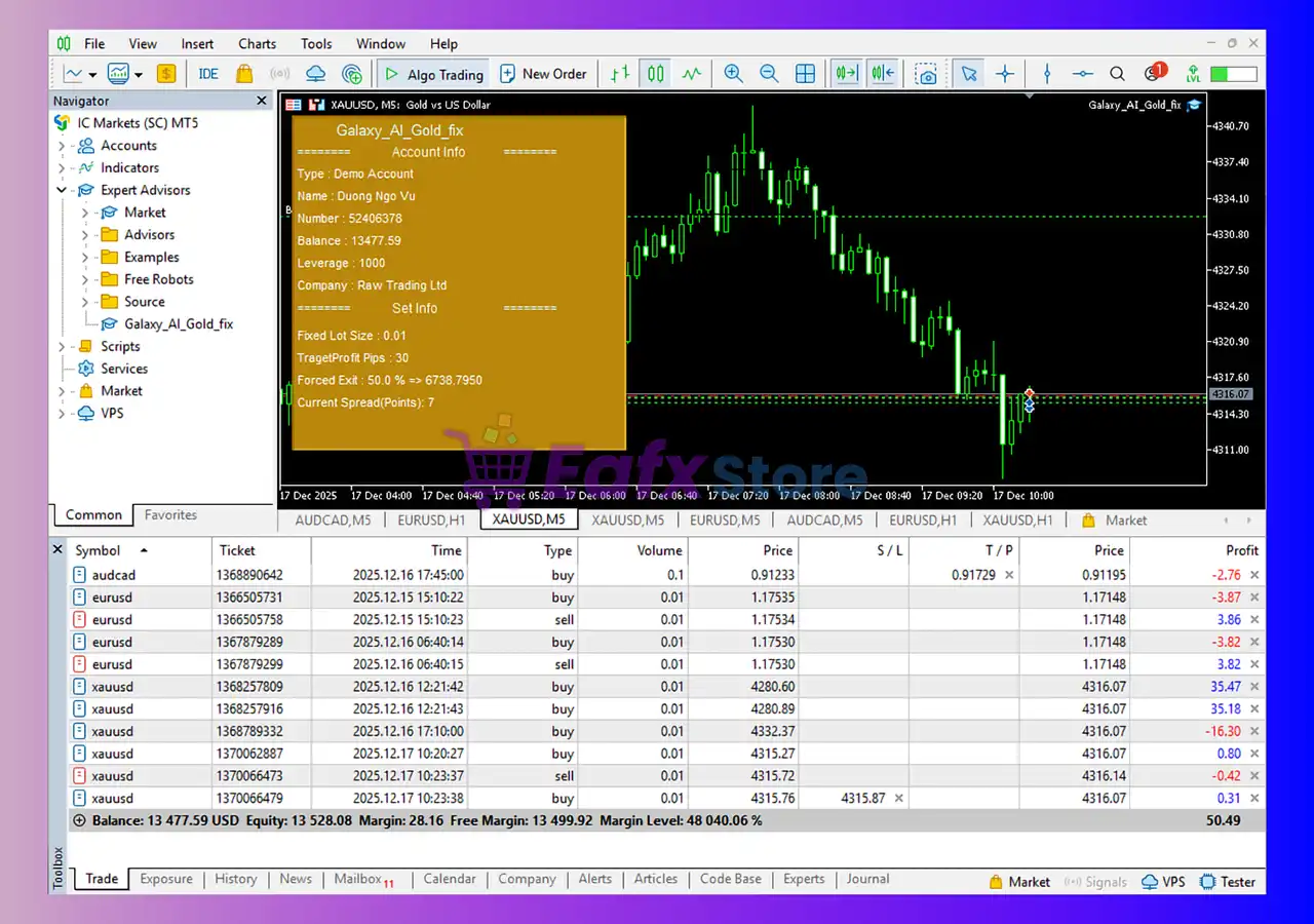 Galaxy AI Gold EA is a professional MT5 Expert Advisor designed exclusively for XAUUSD. It uses a private fixed-lot ladder combined with controlled martingale averaging to exploit gold’s intraday volatility through small, frequent profit cycles.