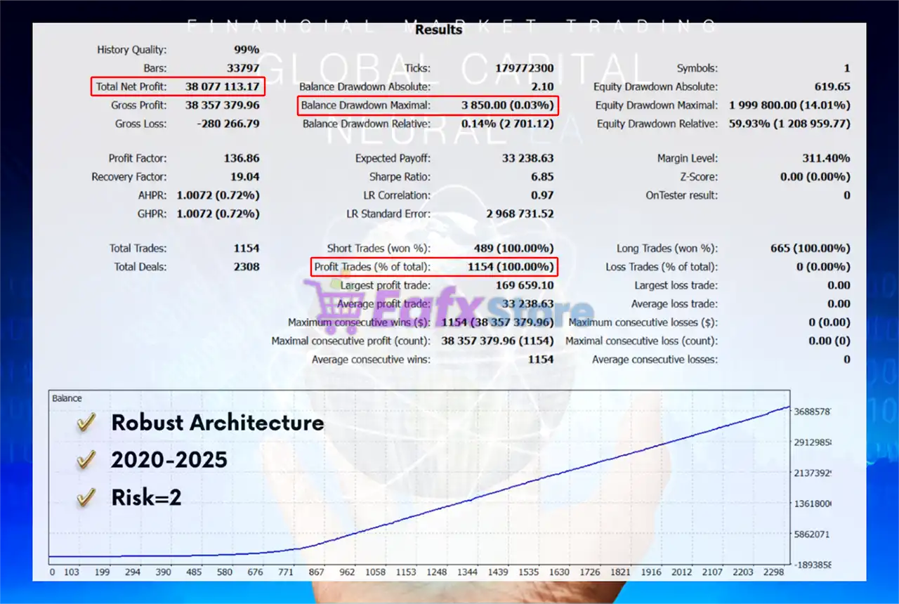 🔹Global Capital Neural MT5 has demonstrated outstanding performance in the backtest results over the 5-year period (2020–2025). The advisor uses the RISK = 2 strategy, showing the ability to manage risk and maintain stable profits.