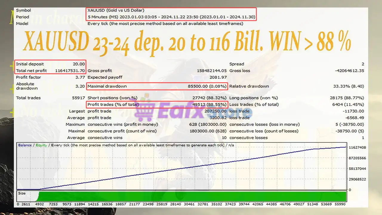 The core strategy is Algorithmically Driven Precision with Dynamic Profit Protection. The EA employs complex algorithms to analyze XAUUSD market data on the M5 timeframe, identifying high-probability entry and exit points.