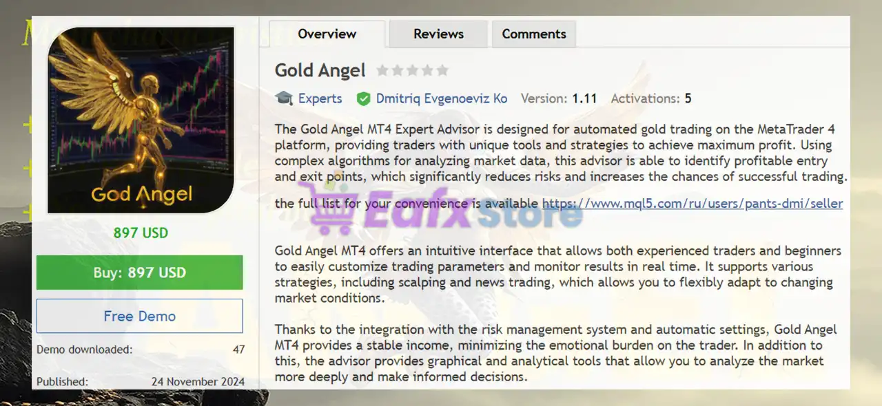 This product is compiled by Dmitriq Evgenoeviz Ko. This author has more than +4 years of experience working on MQL5 with many famous products such as Gold Angel MT4, Golden Harmony MT4, Infinity Gold Impulse MT4, Pharaoh Gold MT4, Apex Gold MT4 and other advisors. Among them, Gold Angel MT4 is his best performing product.