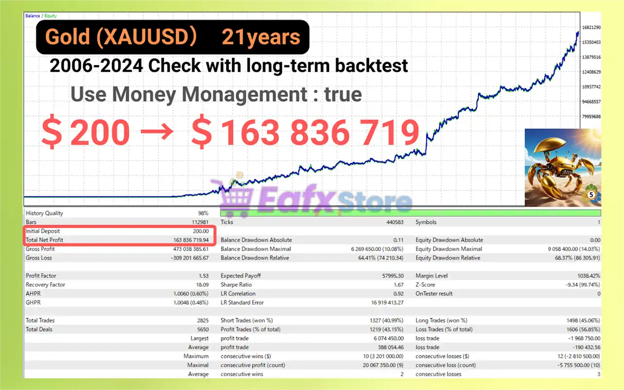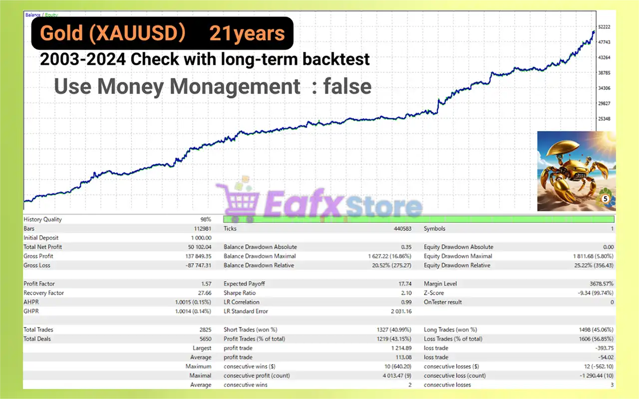 🧩 The Gold Crab Robot backtest trading results achieved impressive profit performance for 21 years on the XAUUSD pair.