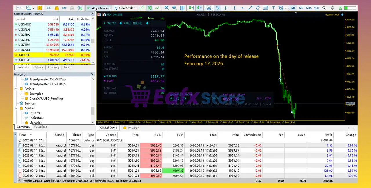 Gold House MT5 trades adaptive swing high and swing low breakouts aligned with trend filters.