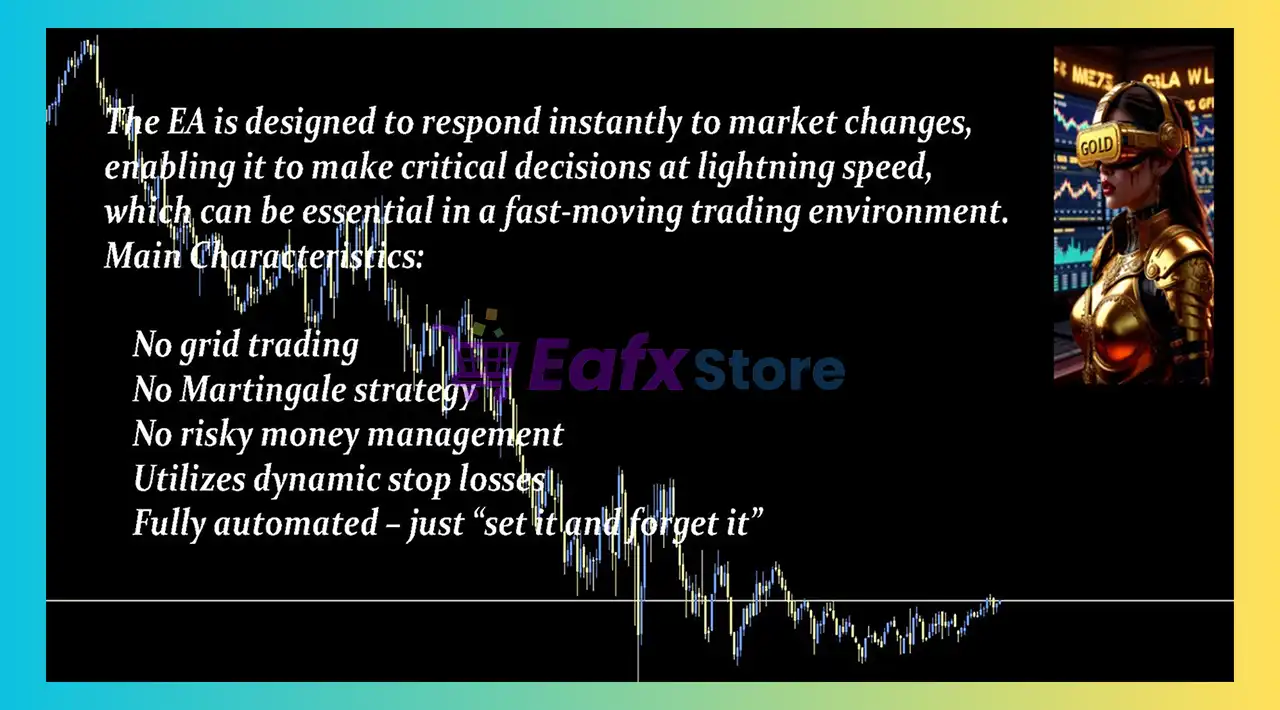 The EA uses an Algorithmically Driven Real-Time Adaptation strategy, analyzing market trends and price fluctuations continuously, adapting to volatility, and opening trades with precise timing.