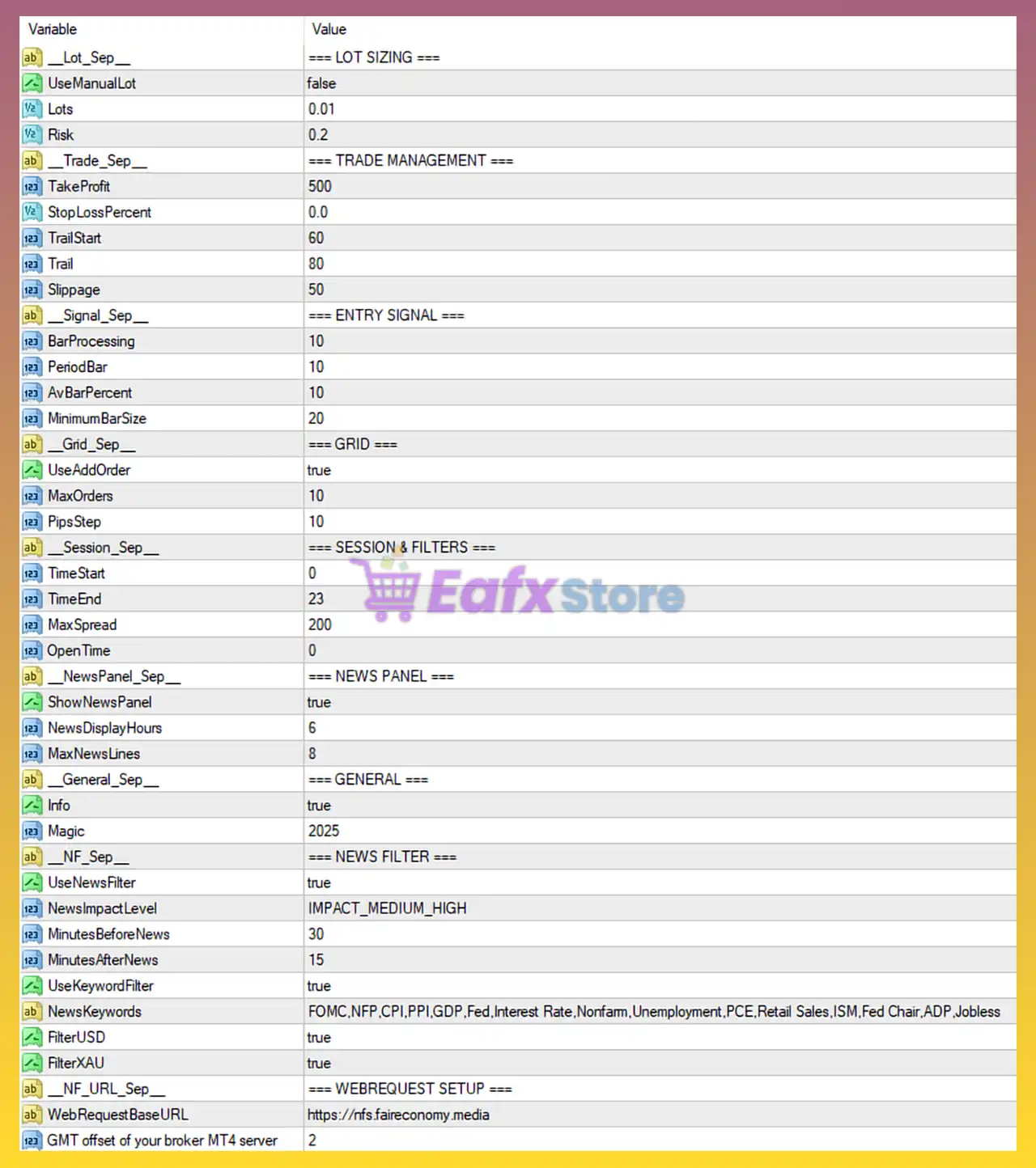 Gold Pulse MT4 uses news filters, spread filters and session controls to avoid trading during unstable or low-liquidity market conditions.
