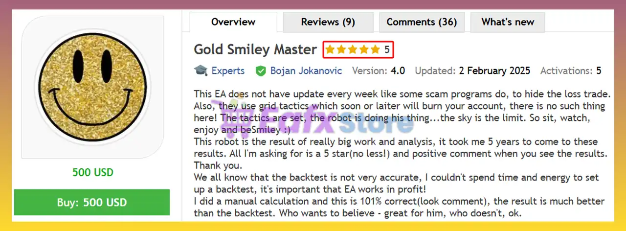 This product is compiled by Bojan Jokanovic. This author has more than +1 years of experience working on MQL5 with many famous products such as Gold Smiley Master EA MT5, Gold Smiley Master MT4 and other advisors. Among them, Gold Smiley Master EA is his best performing products.