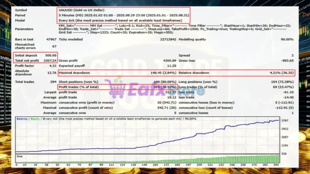 Backtests on the XAUUSD pair demonstrated consistent profitability over 8 months, achieving $3,307.24 net profit from a $500 initial deposit, with a 76.53% win rate and 3.84% maximum drawdown.