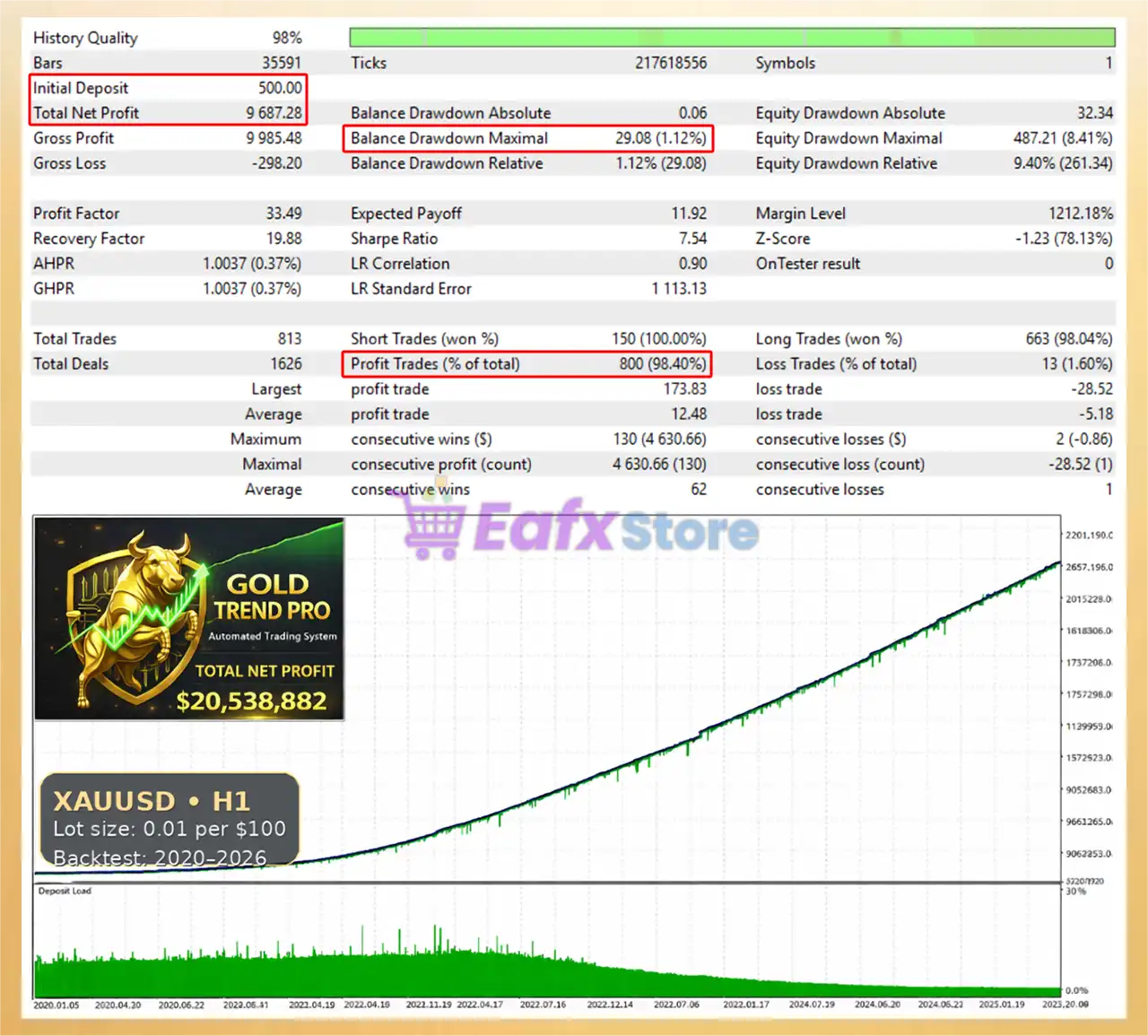 Gold TrendPro Mt5 recommends a minimum deposit of $500 with leverage around 1:50 to maintain balanced risk allocation and stable performance.