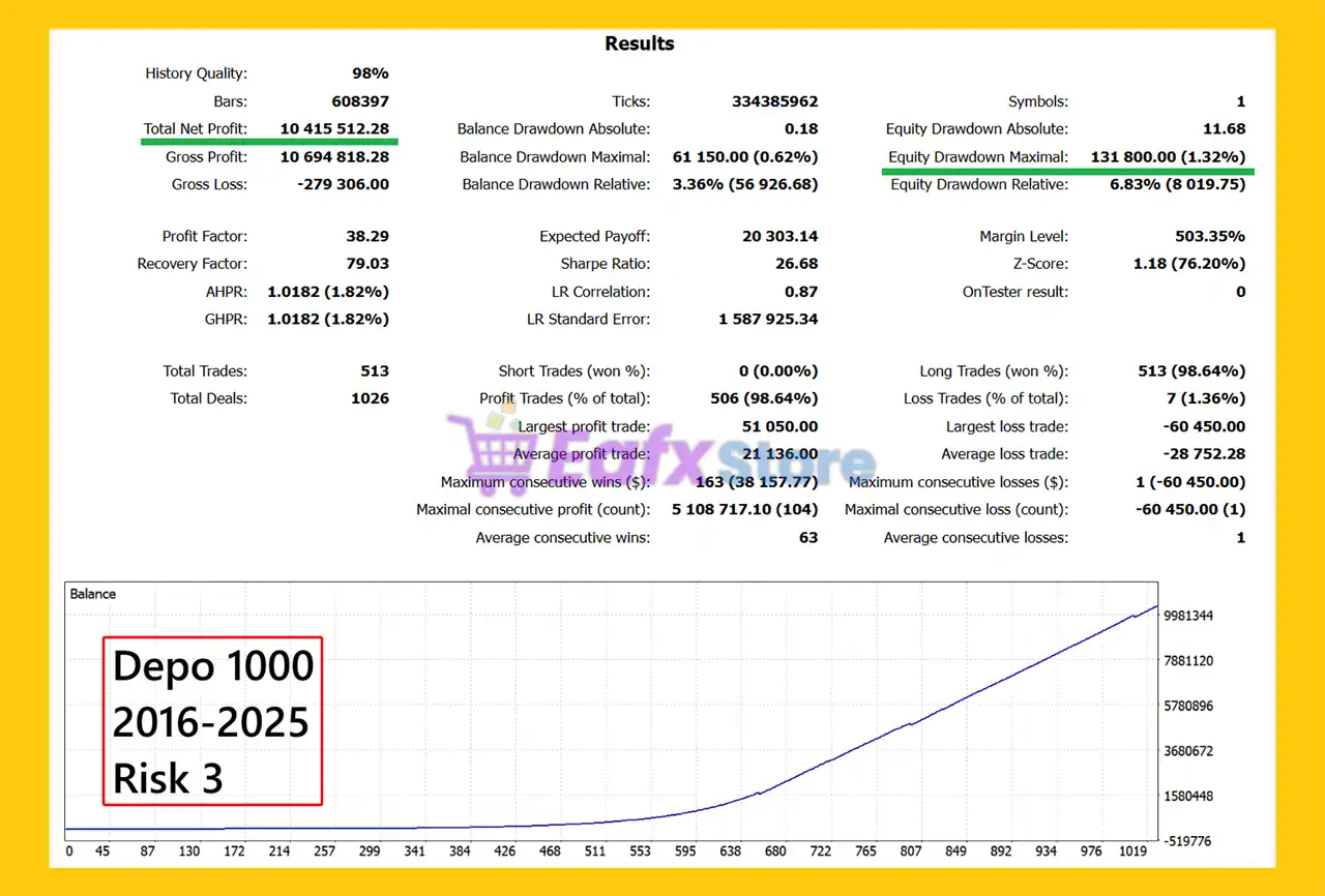 From 2016 to 2025, backtests show an impressive 98.64% win rate, $10.41 million total profit from a $1,000 deposit, and only 0.62% maximum drawdown, highlighting both power and safety.