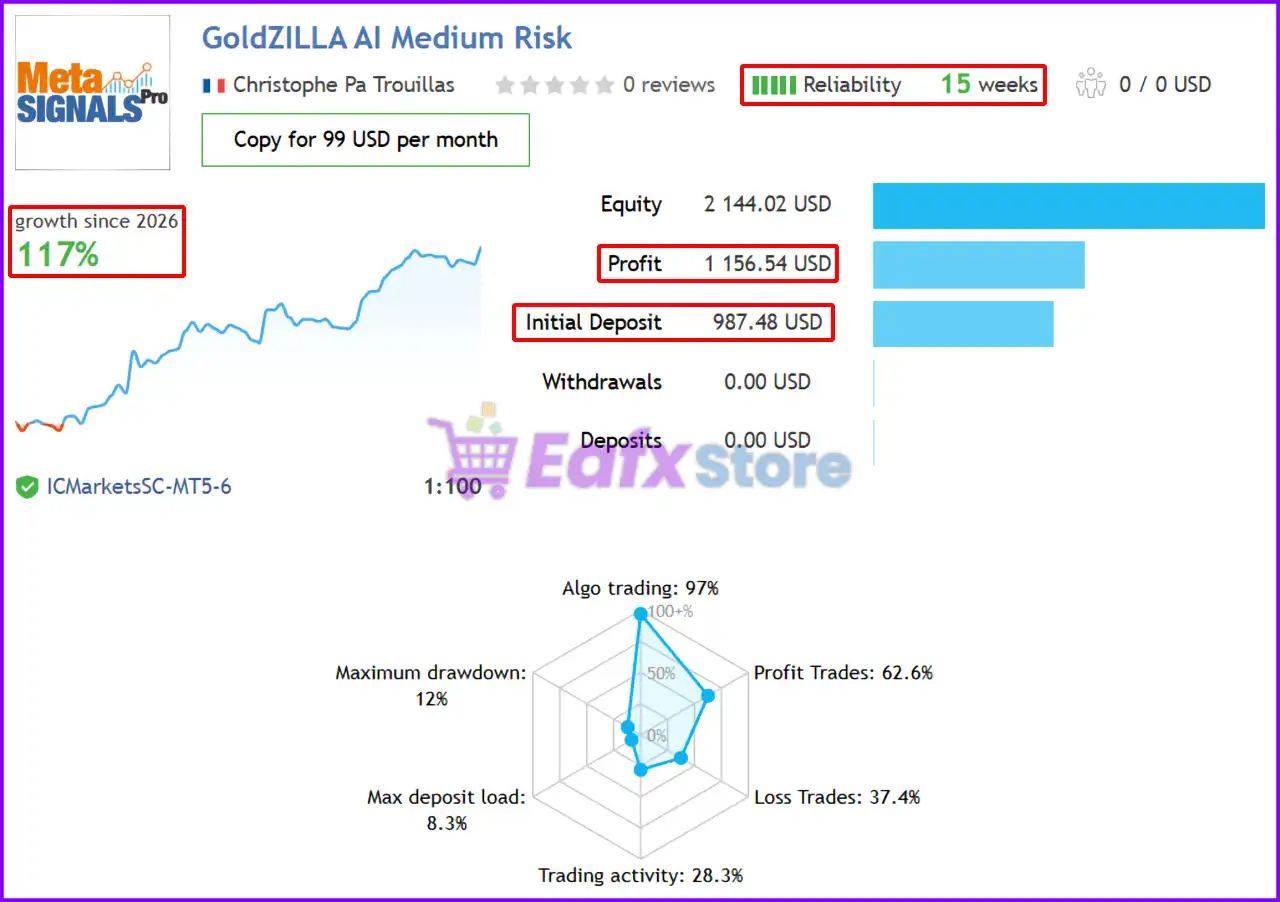 The Gold Zilla AI MT4 achieved impressive profit performance when trading with XAUUSD (Gold). Trading results on real account for 15 weeks of trading.