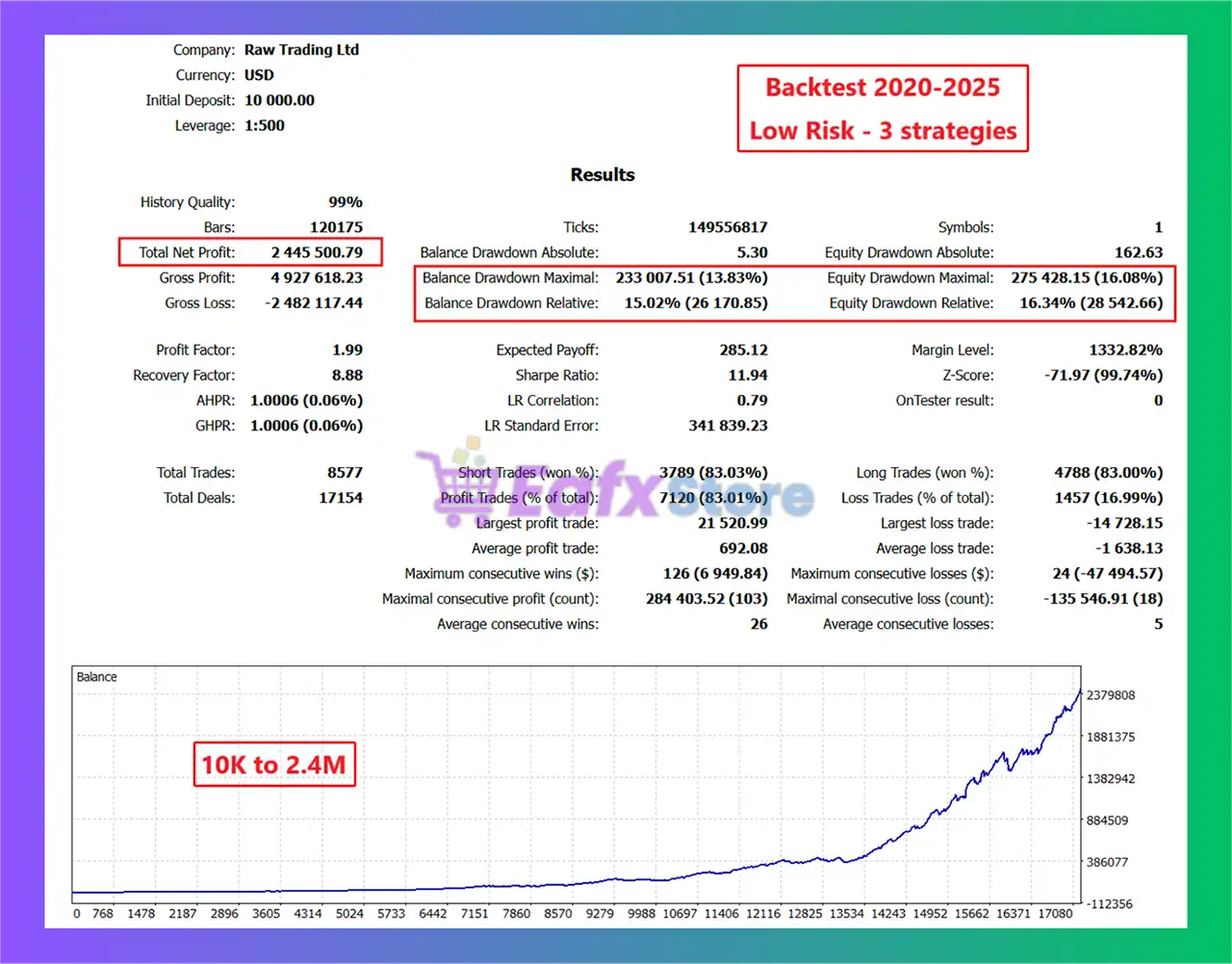🔹The Golden Blitz MT4 was tested in Very Low-Risk settings over a 5-year backtest (2020–2025). Using 3 combined trading strategies, the EA achieved consistent profits with exceptionally low drawdown.