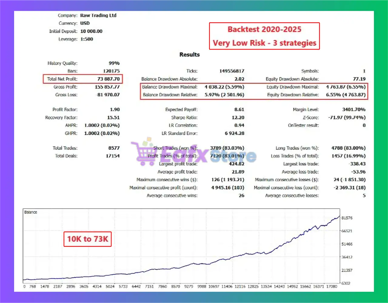 🔹The Golden Blitz MT4 was tested over a 5-year backtest (2020–2025) using Low-Risk settings with 3 integrated strategies.