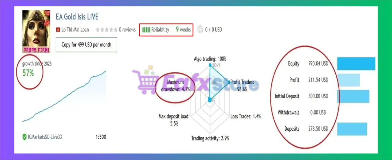 With a $300 deposit, it achieved +57% growth in 9 months, a 98.6% win rate, and only 4.7% drawdown.