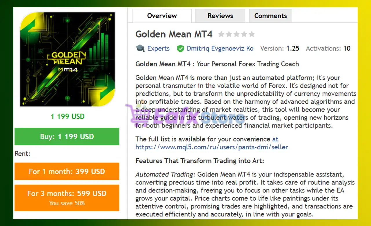 This product is compiled by Dmitriq Evgenoeviz Ko. This author has more than +5 years of experience working on MQL5 with many famous products such as Golden Mean MT4, Aisha Gold MT4, Infinity Gold AI MT4Gold Asset MT4Gold Nugget AI MT4 and other advisors. Among them, Golden Mean MT4 is his best performing product.