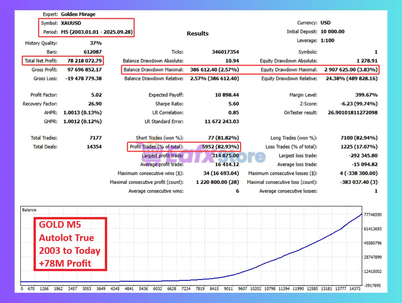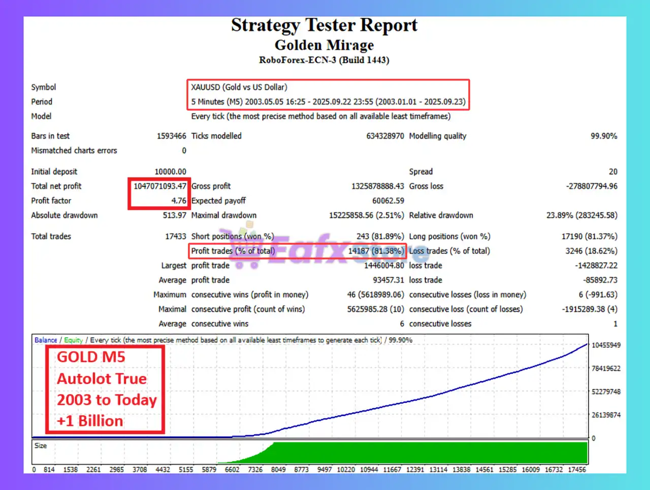 The Golden Mirage MT4 backtest trading results achieved impressive profit performance for 22 years on the XAUUSD (Gold).