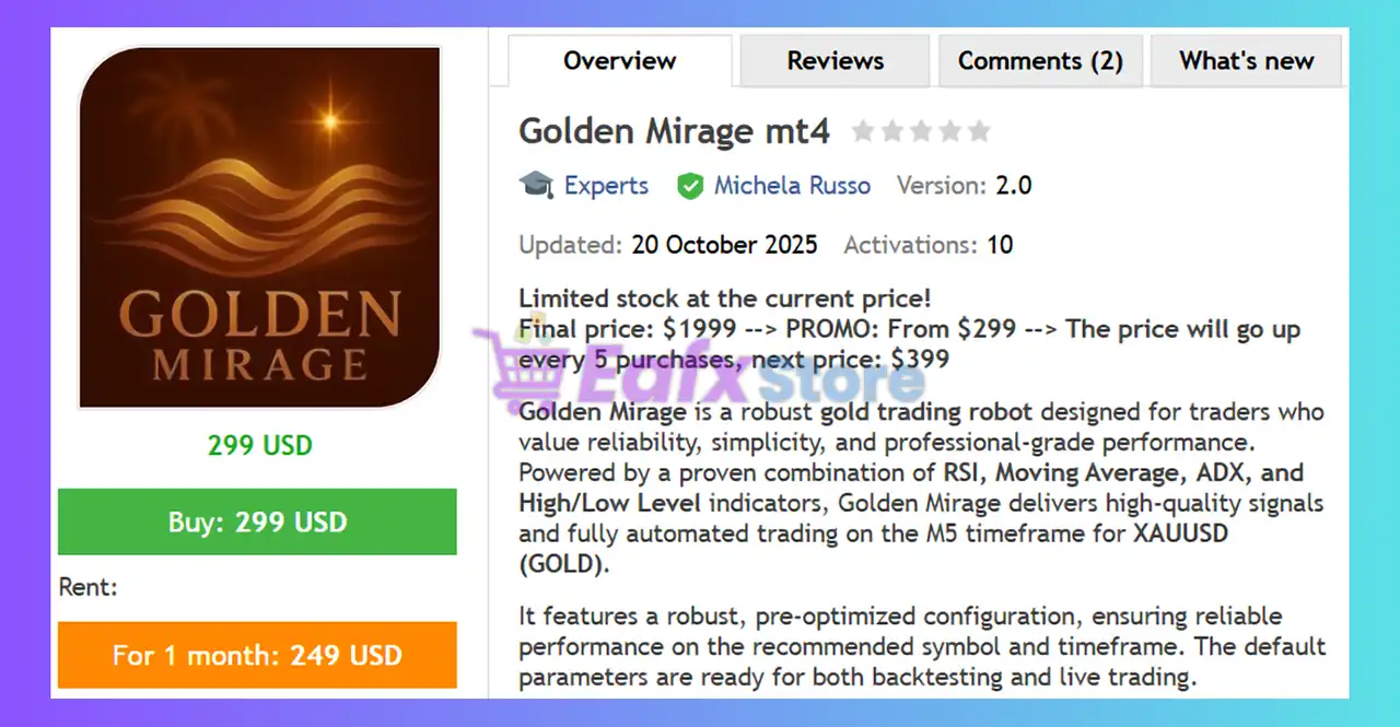 This product is compiled by Michela Russo. This author has more than +6 years of experience working on MQL5 with many famous products such as Golden Mirage MT4, Golden Mirage MT5, Stratos Mistral MT5, Hippo Trader Pro, Dragon Scalper Pro and other advisors. Among them, Golden Mirage MT4 is his best performing product.