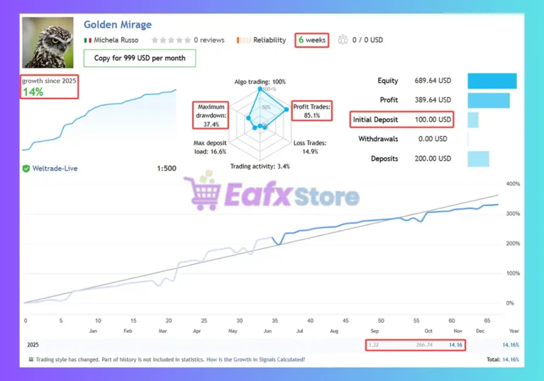 Golden Mirage stands out for its simplicity, reliability, and proven indicator-based logic. It’s Prop Firm compliant, pre-optimized, and risk adaptive, offering traders a stable and realistic way to trade gold profitably without risky strategies like Martingale or Grid.