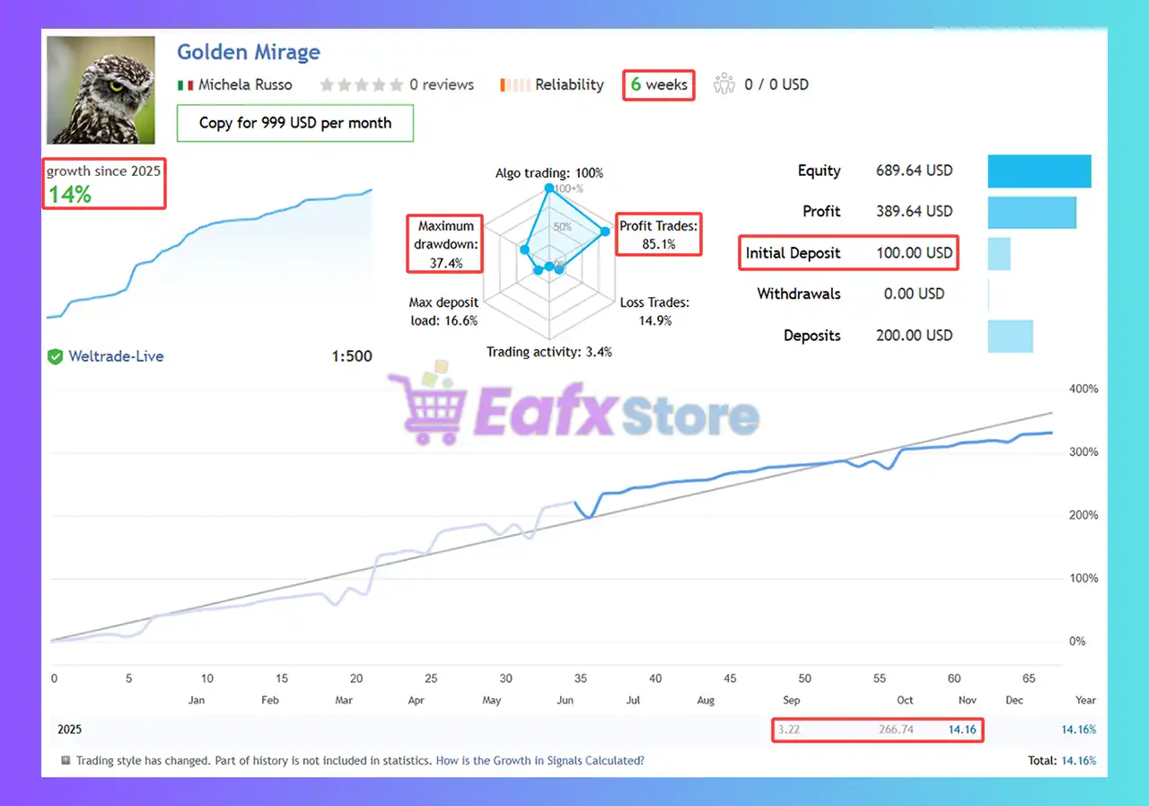 The Golden Mirage MT4 achieved impressive profit performance when trading with GOLD pair. Trading results on real account for 6 consecutive weeks of trading: