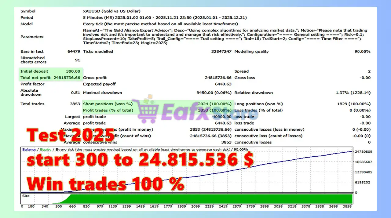 Golden Moon AI backtest trading results achieved impressive profit performance for 12 months on the XAUUSD pair.