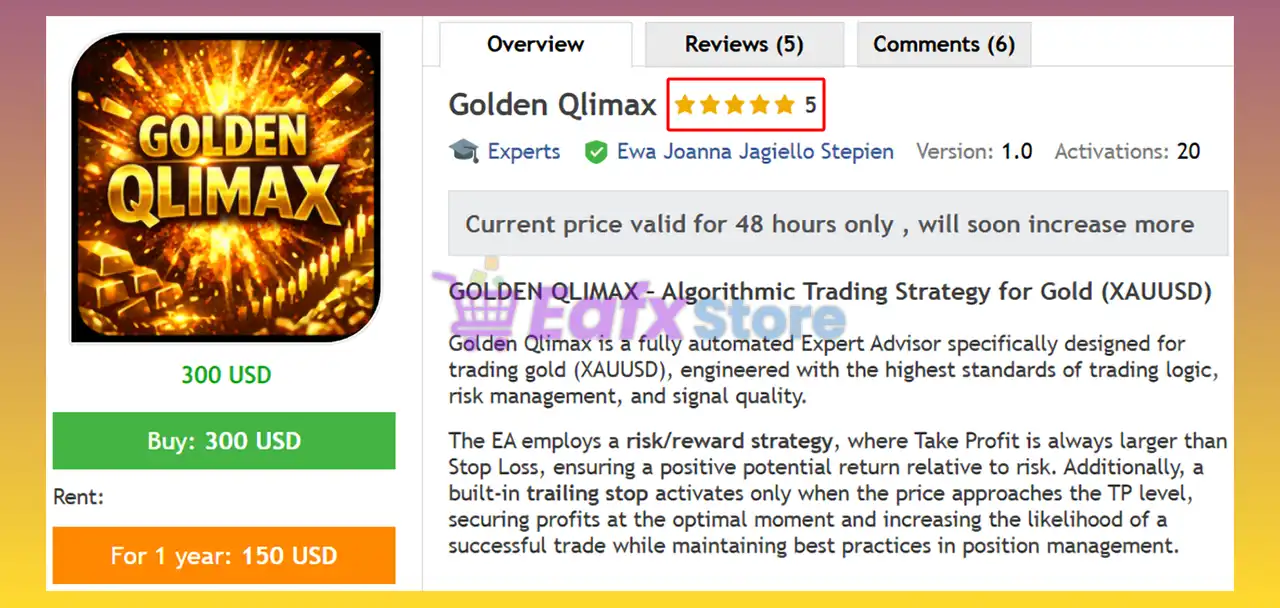 This product is compiled by Ewa Joanna Jagiello Stepien. This Russia author has more than +2 years of experience working on MQL5 with many famous products such as Golden Qlimax EA MT5, Aurum Trinity EA MT5, Solution EA MT5, Madness EA MT5 and others. Among them, Golden Qlimax EA is his best performing product.