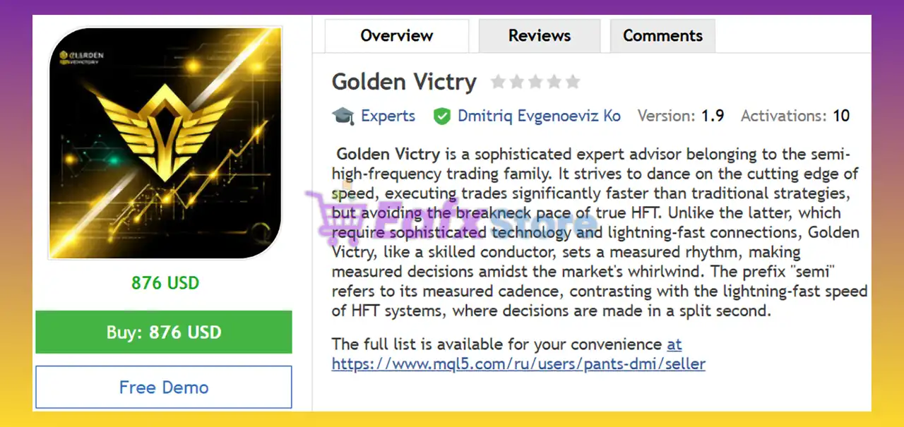 This product is compiled by Dmitriq Evgenoeviz Ko. This author has more than +4 years of experience working on MQL5 with many famous products such as Golden Victry MT4, Infinity Gold Impulse MT4, Pharaoh Gold EA, Apex Gold MT4, Gold Angel MT4, Gold Lady MT4 and other advisors. Among them, Golden Victry EA is his best performing product.
