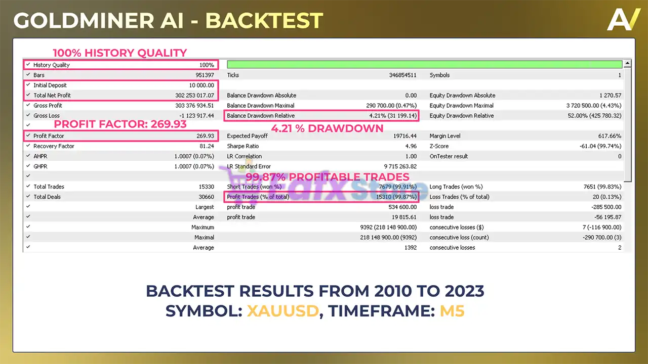 Goldminer AI MT5 is specifically optimized for XAUUSD trading, focusing on capturing profitable opportunities in the gold market.