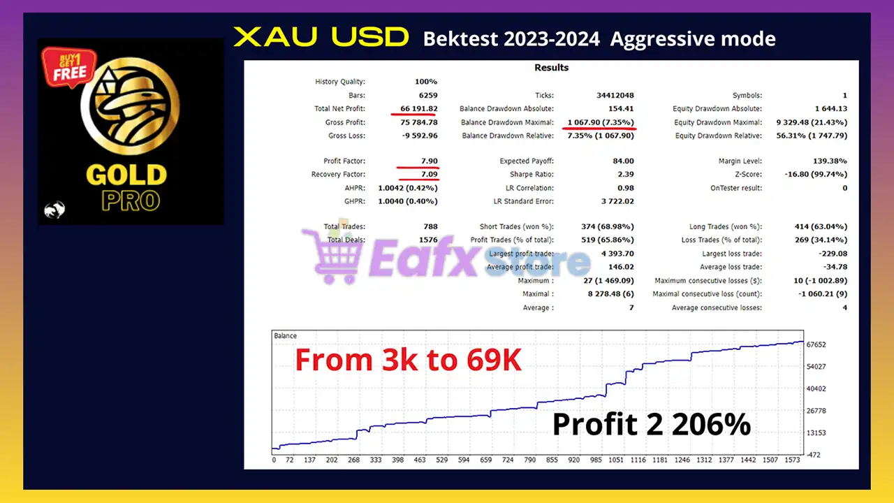 The GoldPro MT5 backtest trading results achieved impressive profit performance for 3 years (2020 – 2023) on the XAUUSD (Gold).