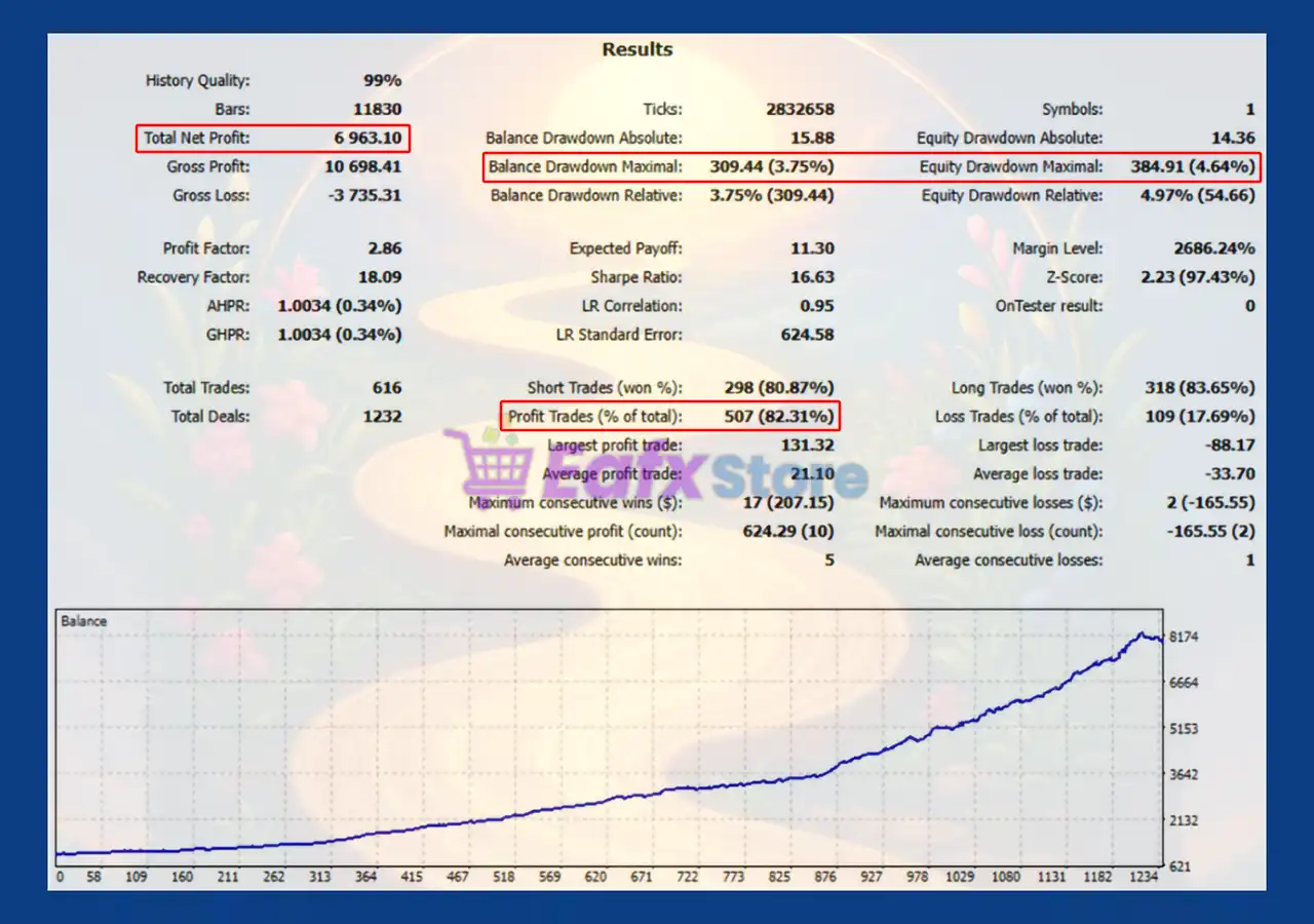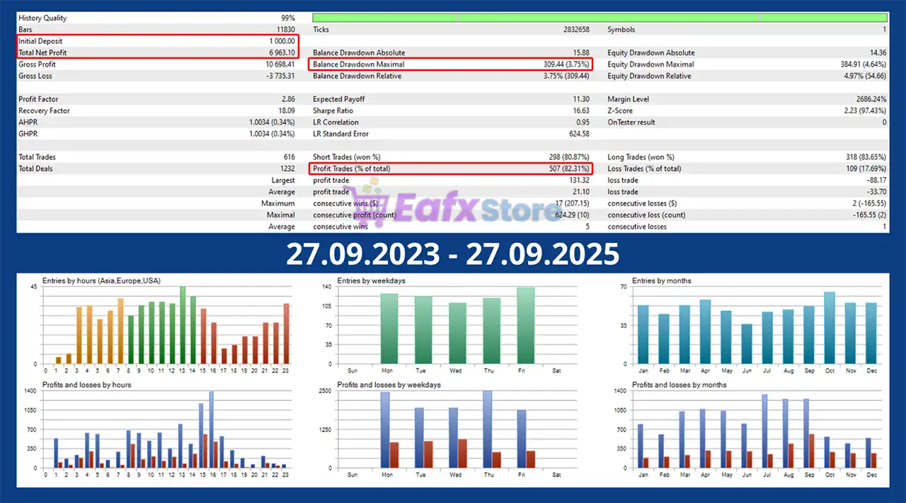 Backtests (2023–2025) showed $6,963 net profit from $1,000, with an 82.31% win rate and just 3.75% drawdown.