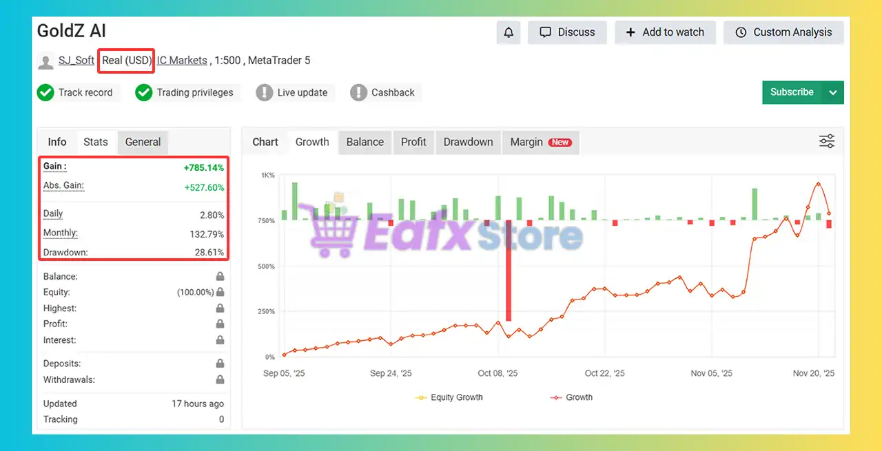 ✅ Verified by MyFxBook, it has achieved a total gain of +785.14%, average daily profit of 2.80%, average monthly profit of 132.79%, and a maximum drawdown of 28.61%.